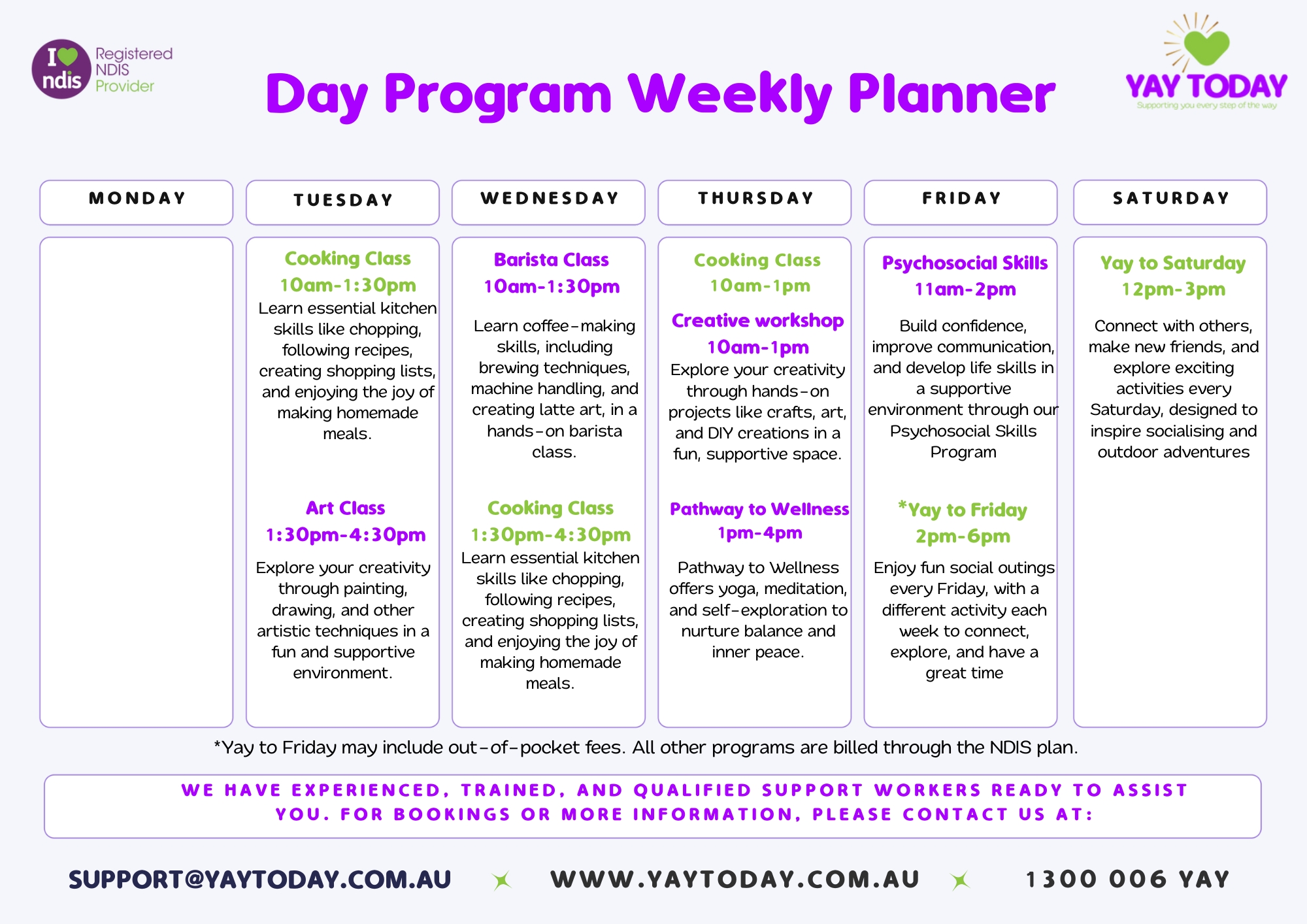 Need extra support? We can provide a dedicated support worker to assist you during the class and transport you to and from the workshop. We’re here to make it easy for you to participate and enjoy every moment!